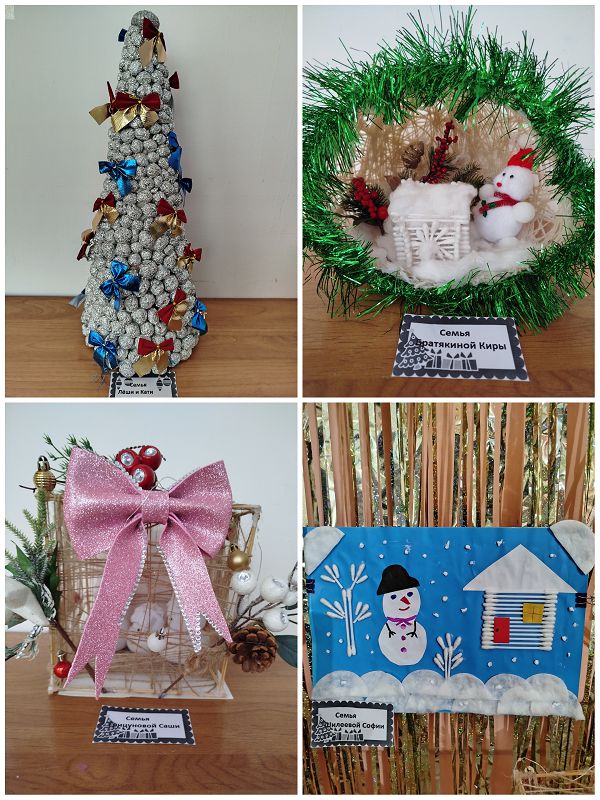 На выставке были представлены поделки детей разновозрастной группы «Пчёлка» изготовленные совместно с родителями. Здесь можно увидеть поистине необыкновенные творения: елочные игрушки, композиции из различных материалов: бумаги, ткани, ленточек, ниток и другого бросового материала.