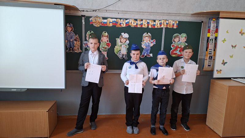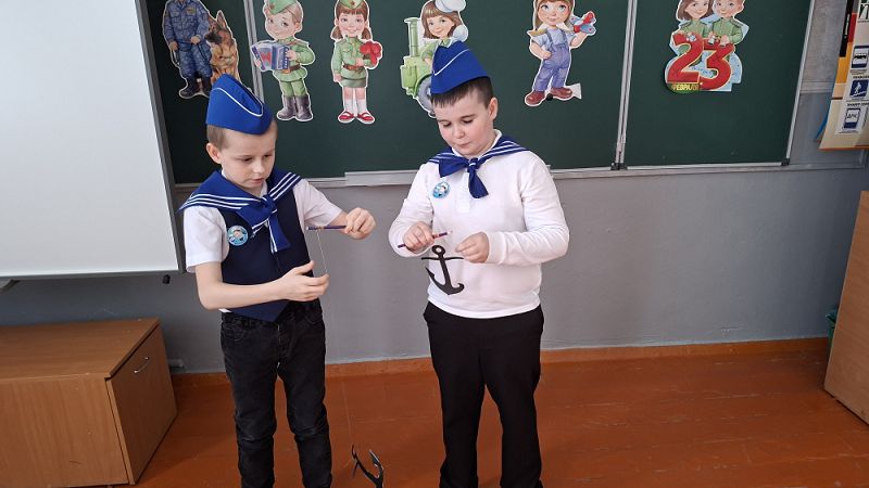 В преддверии Дня защитника Отечества 20 февраля в 4 классе состоялось весёлое и энергичное мероприятие «А ну‑ка, мальчики!». В нём приняли участие две команды: «Моряки» и «Пограничники». Мальчишки соревновались в конкурсах: «Силачи», «Собери автомат», «Меткий стрелок», «Разминировать поле», «Подними якорь».