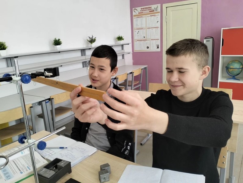 Сегодня семиклассники провели экспериментальную работу «Выяснение условия равновесия рычага», используя рычаг, набор грузов, линейку.