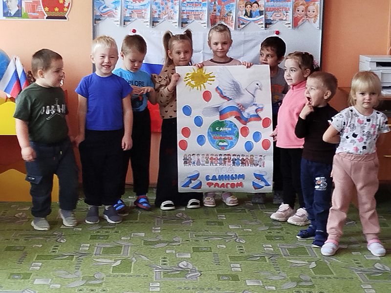 А также в совместной деятельности по аппликации закрепили понятия, что такое мир, дружба, единство и коллективно сделали плакат "Под единым флагом". Проведение таких мероприятий помогает воспитывать чувство любви к Родине, гордости за неё, за народ, населяющий Россию.